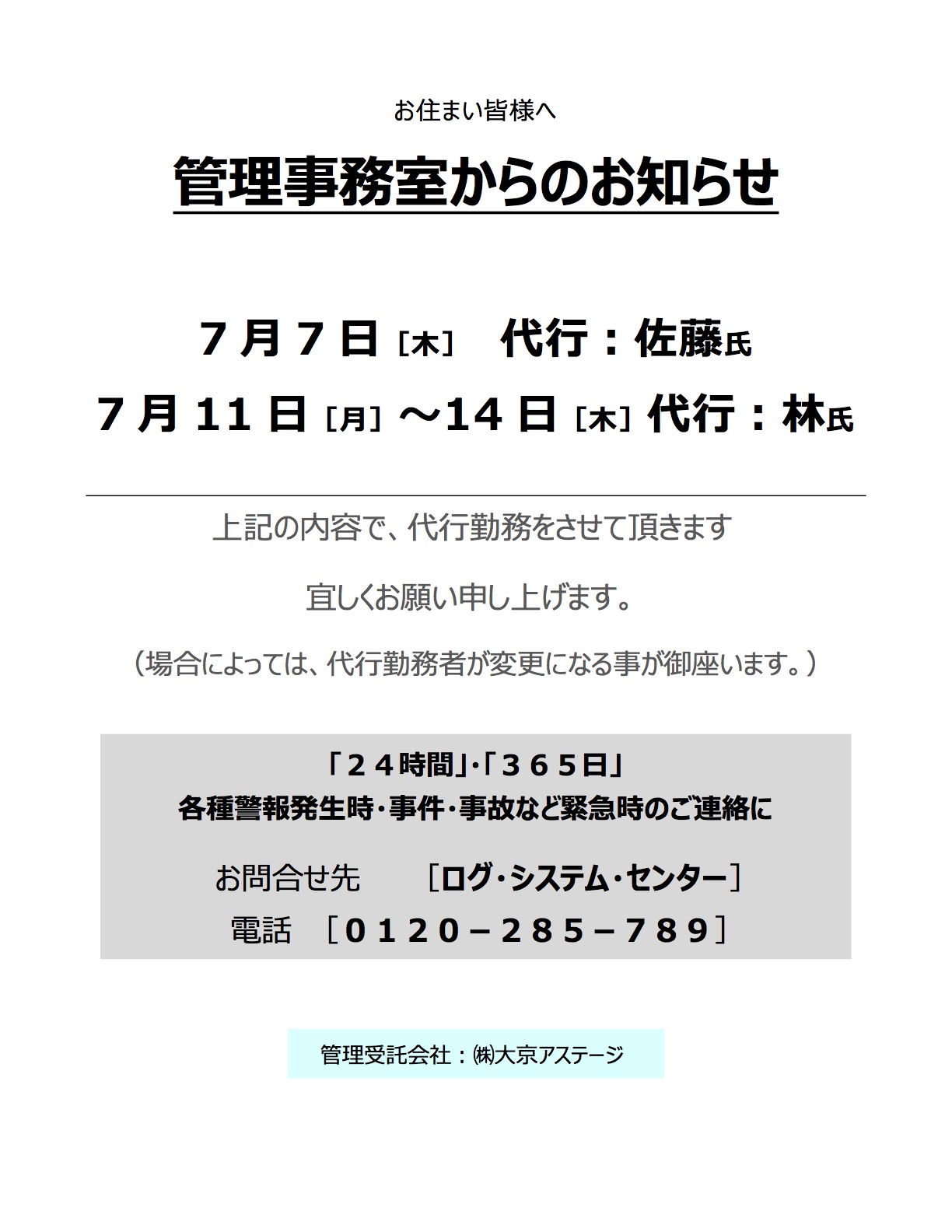 管理事務室不在、代行のお知らせ(7日、11〜14日)