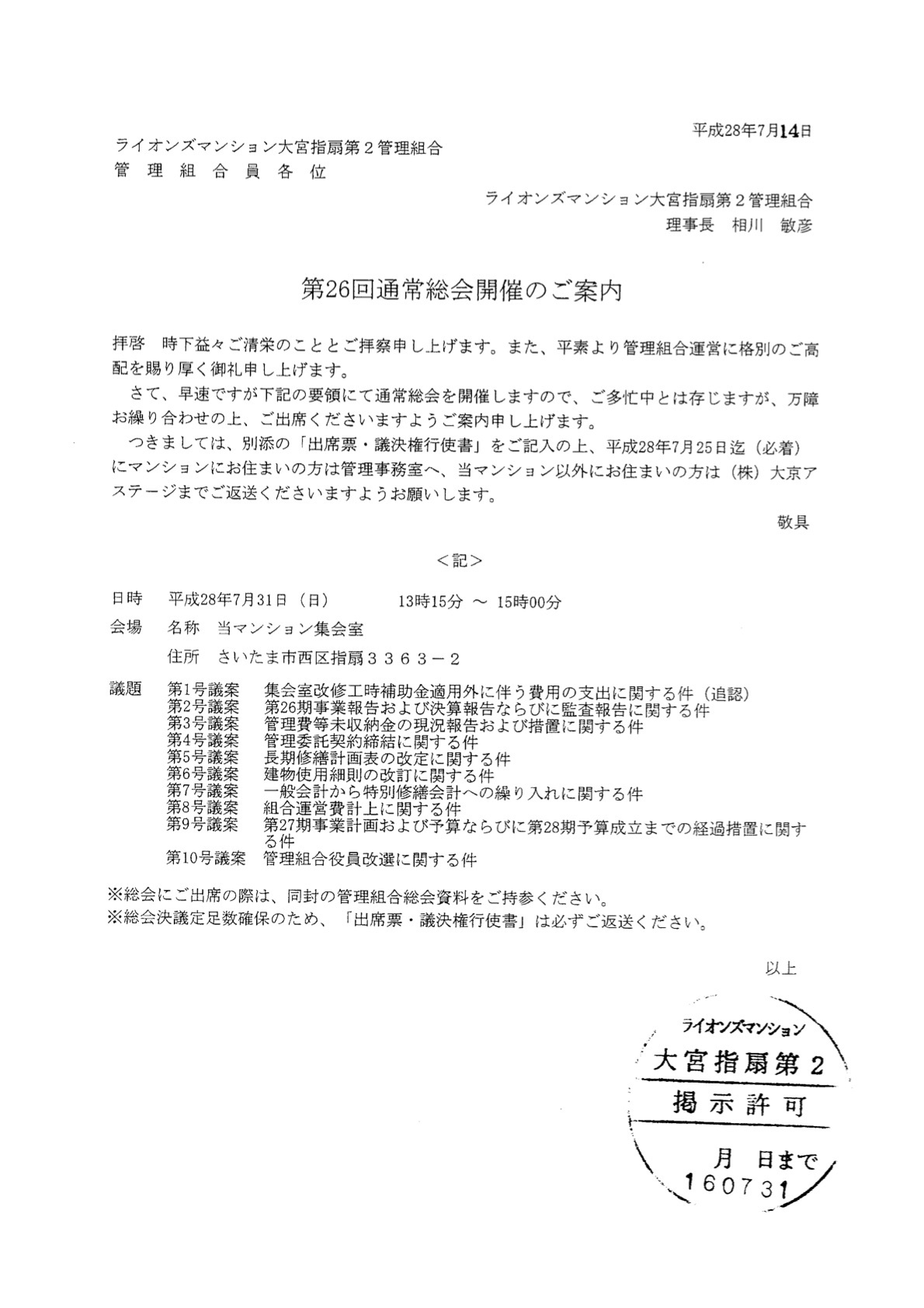 7月31日管理組合第26回総会開催のご案内