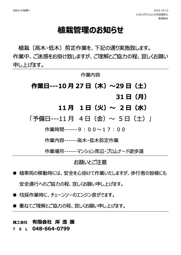 10月27日〜11月2日植栽剪定作業のお知らせ