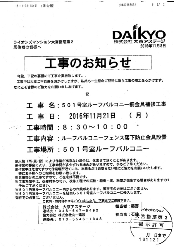11月21日501ルーフバルコニー柵工事のお知らせ