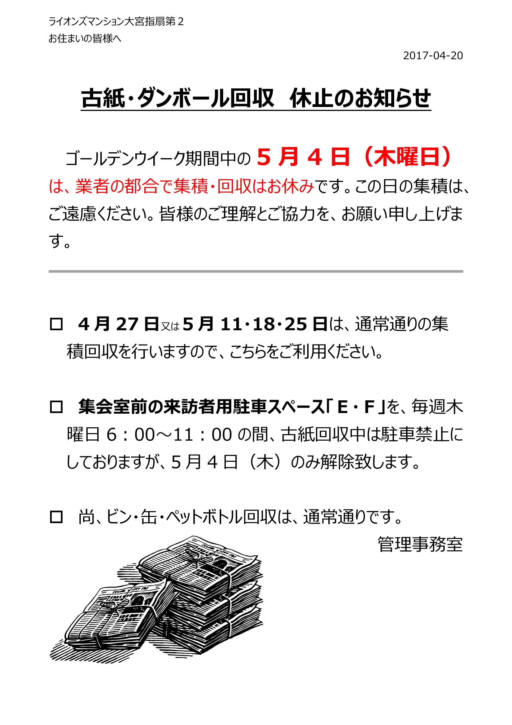 5月4日(木)古紙回収お休み