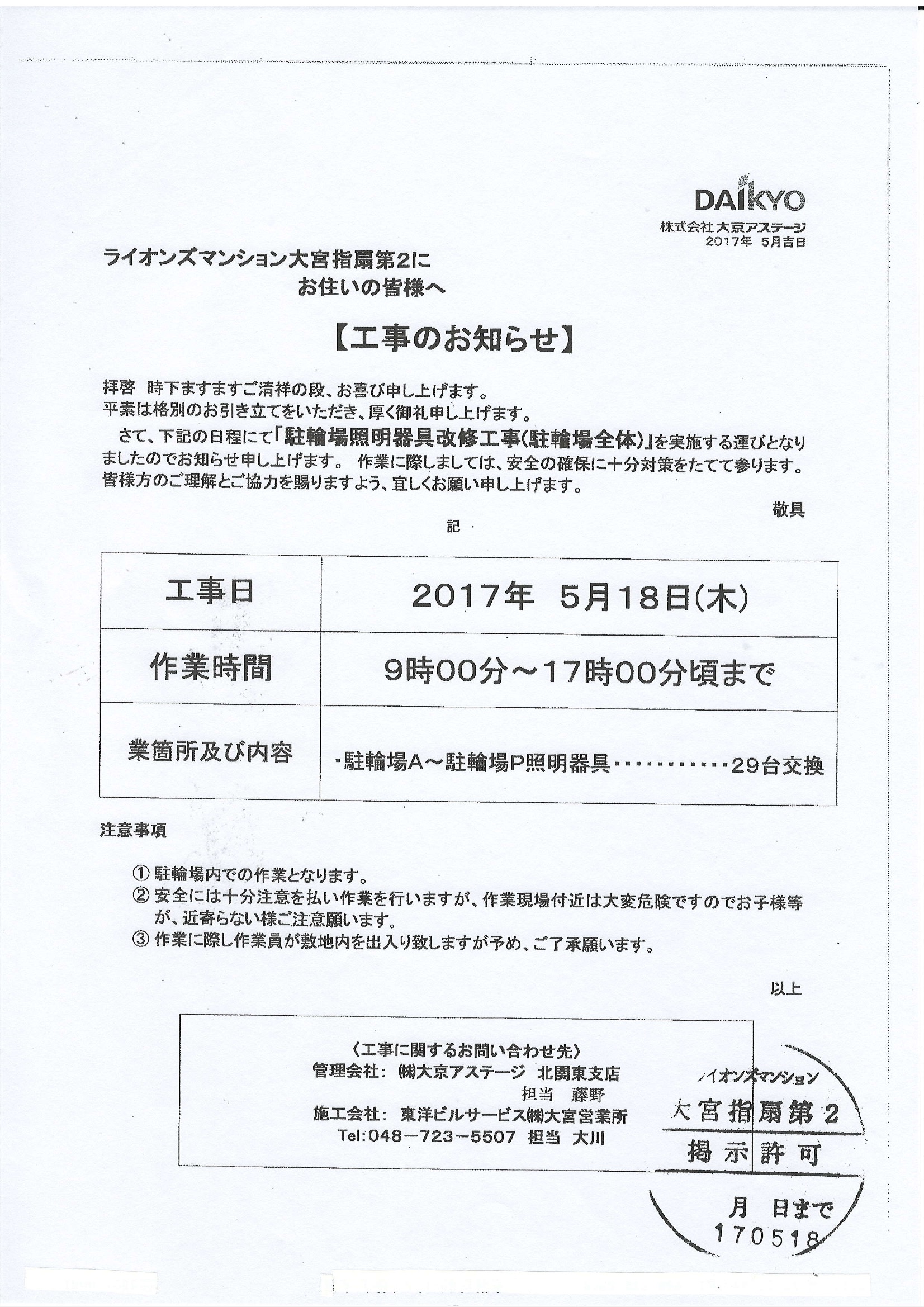 5月18日(木駐輪場照明工事のお知らせ