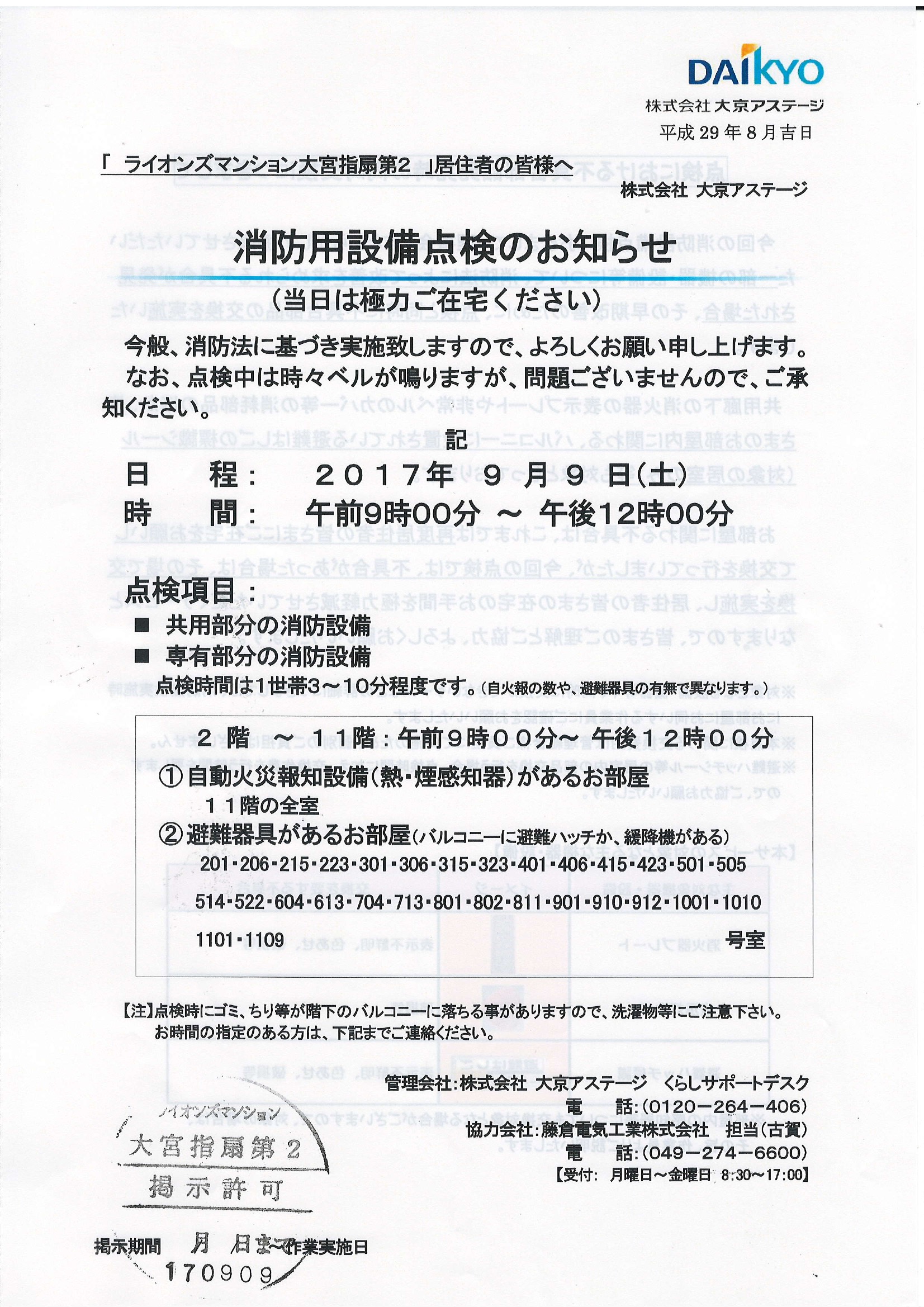 9月9日(土)消防用設備点検のお知らせ