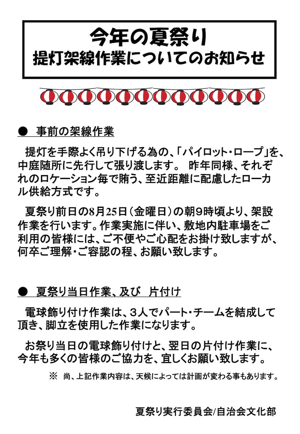夏祭り提灯飾り付け作業のお知らせ
