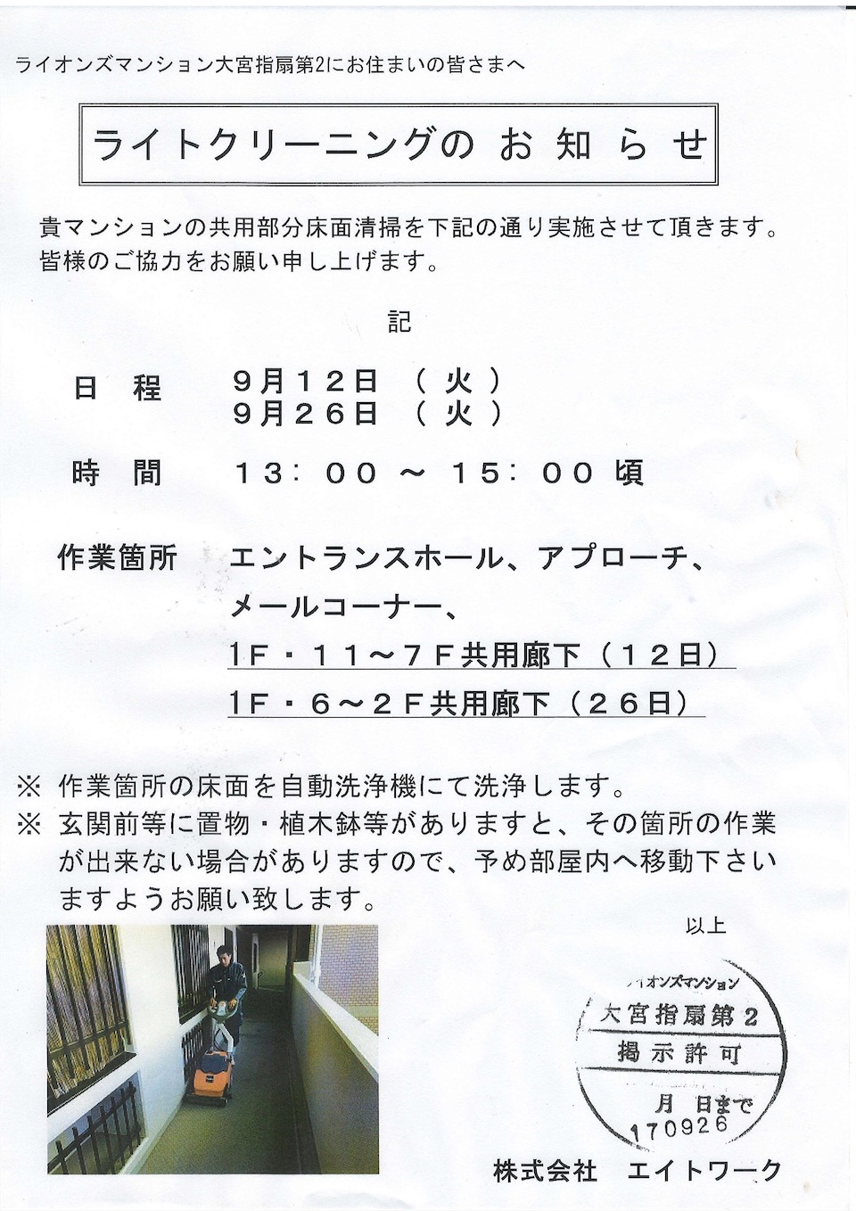 9月12日(火)、26日(火)共用部分床清掃実施のご案内