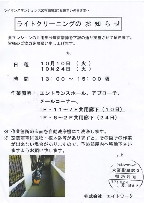 10月10日(火)、24日(火)共用廊下等床清掃実施のお知らせ