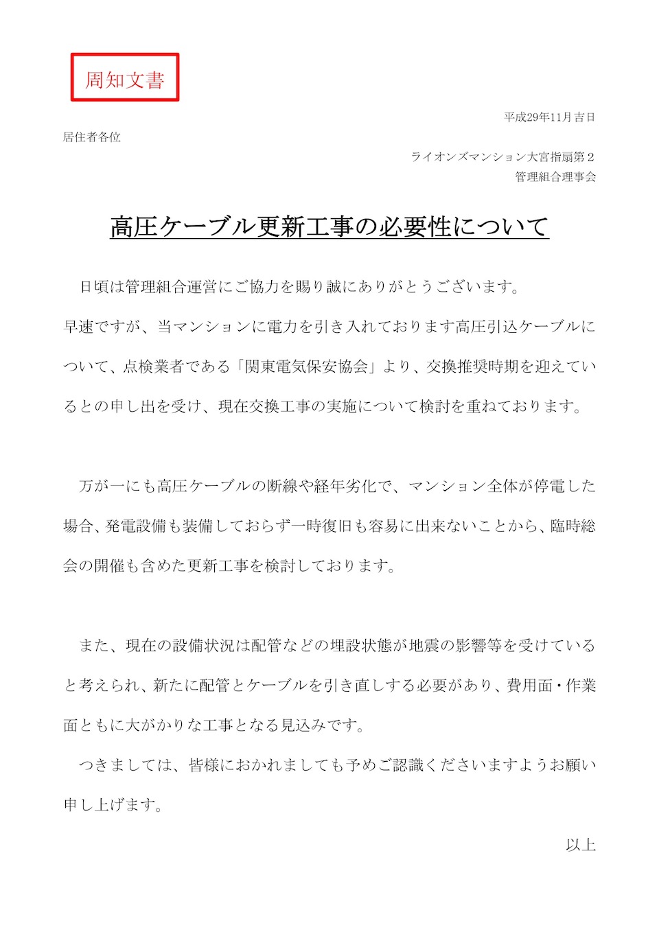 電力引込高圧ケーブル更新工事検討のお知らせ