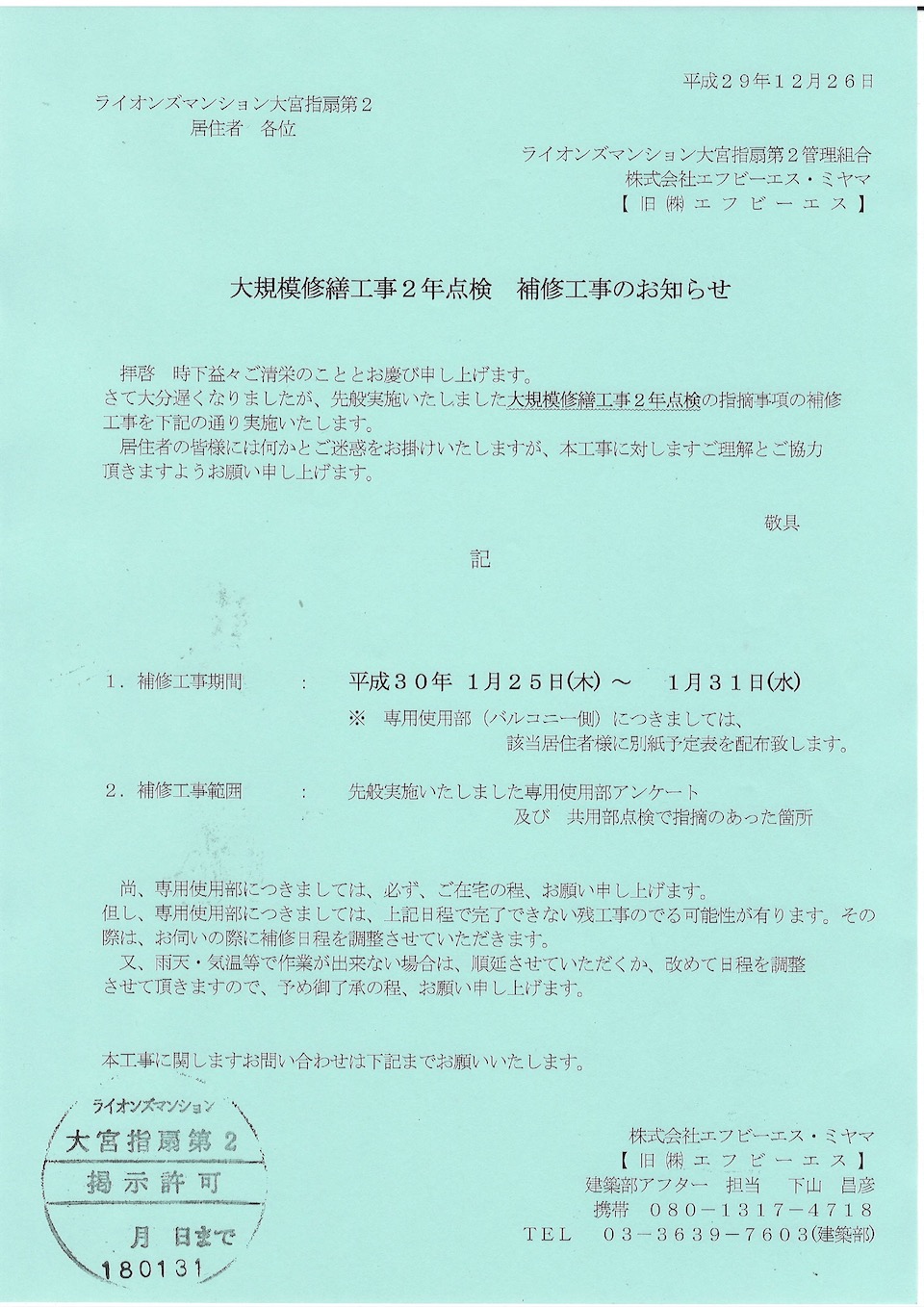 1月25日(木)〜30日(水)大規模修繕工事2年目補修工事のお知らせ