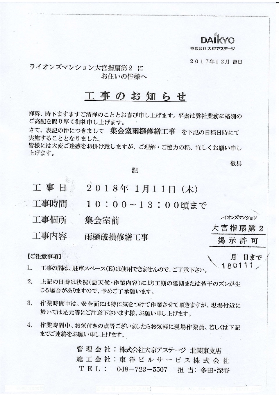 1月11日(木)集会室雨樋修繕工事実施のお知らせ