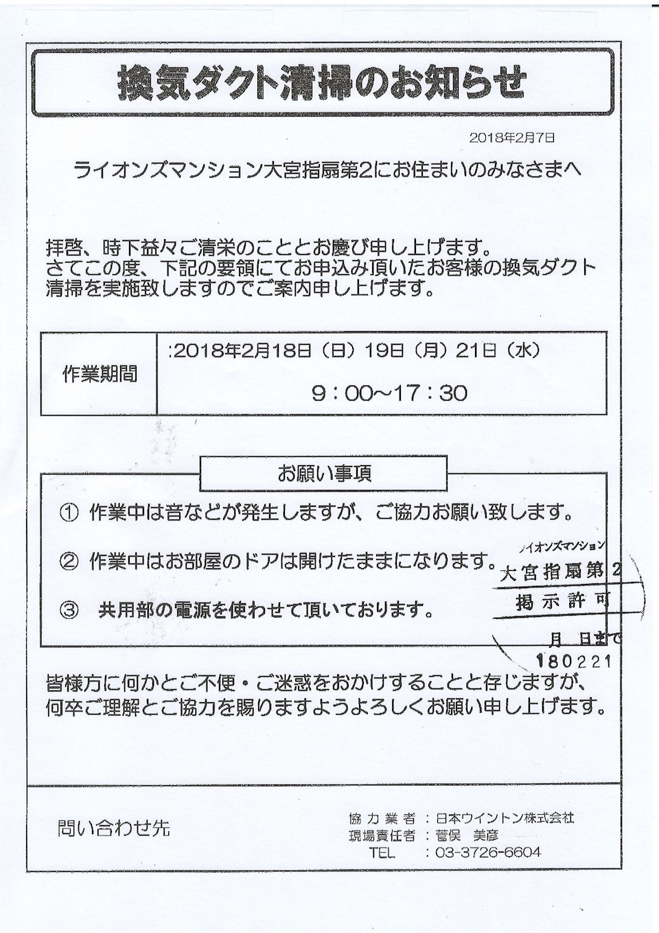 2月18日(日)〜19日(月)排気ダクト清掃のお知らせ