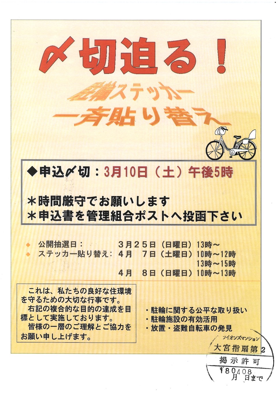 駐輪ステッカー一斉貼り替え締め切り迫る
