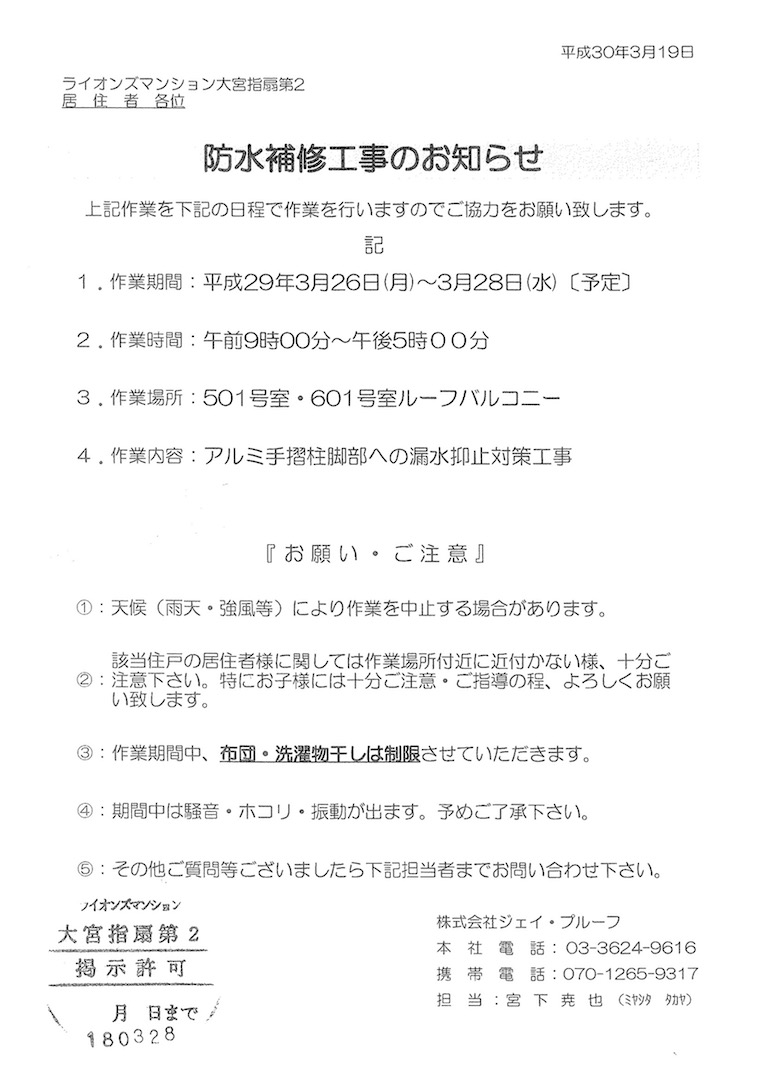 3月26日(月)〜28日(水)ルーフバルコニー防水補修工事のお知らせ