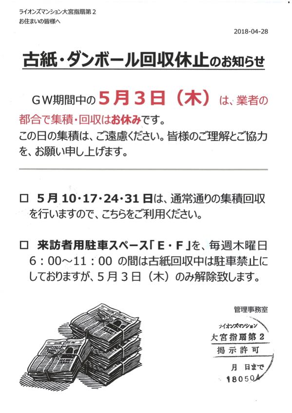 5月3日(木)古紙ダンボール回収休止案内
