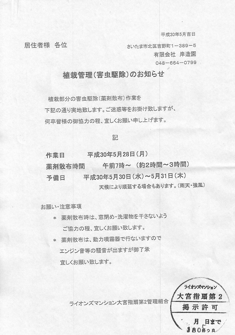 5月28日(月)植栽管理(害虫駆除)のお知らせ