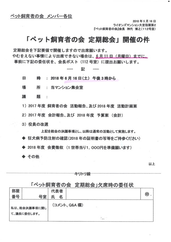 6月16日(土)ペット飼育者の会定期総会開催案内