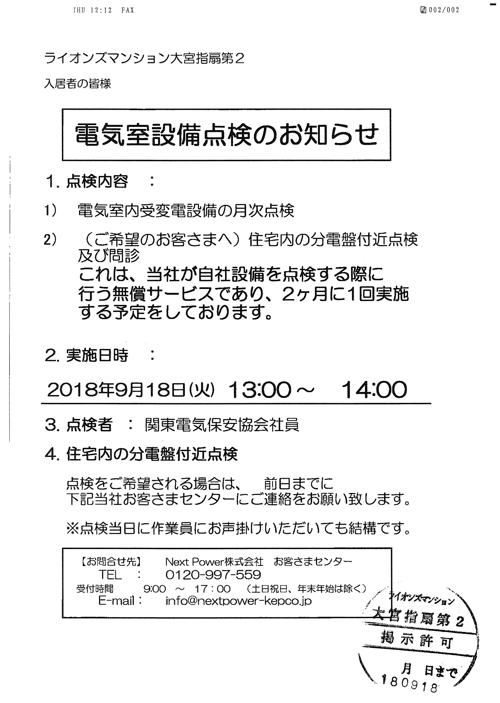 9月18日(火)電気室設備点検のお知らせ