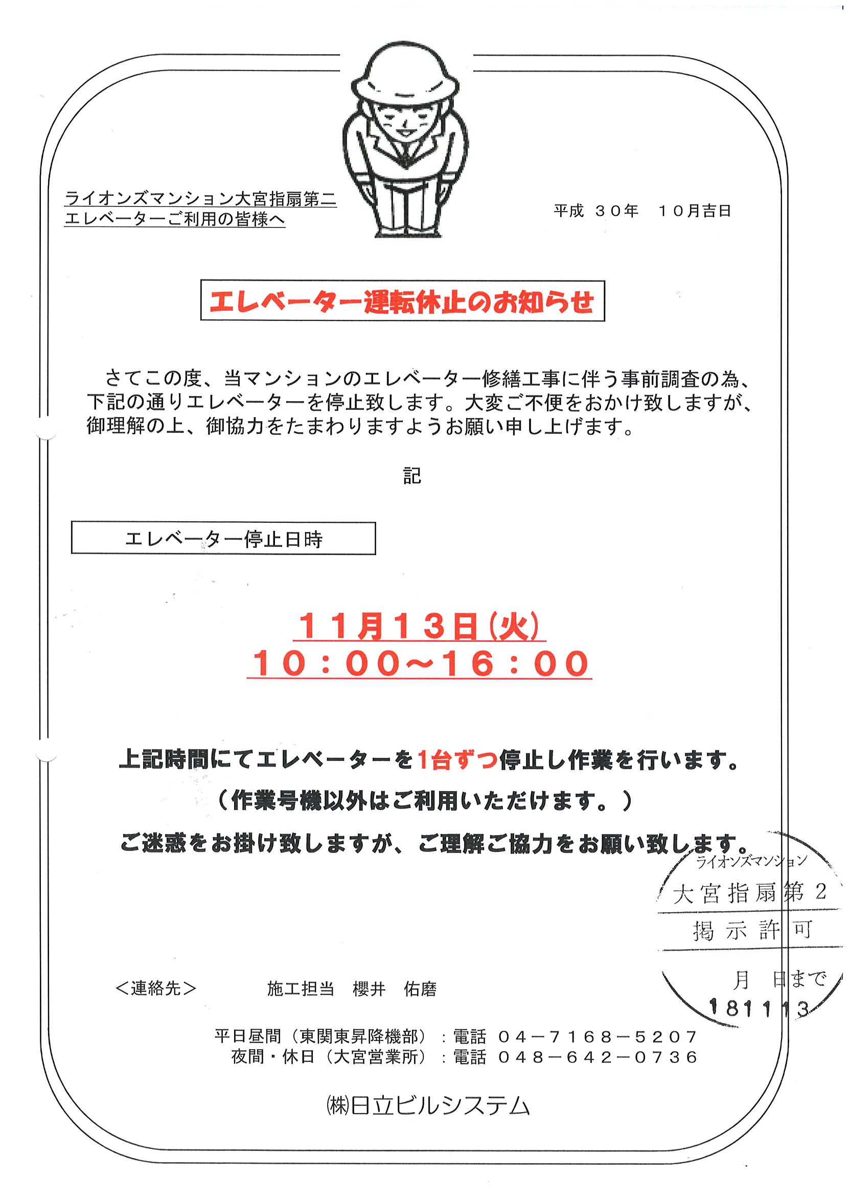 11月13日(火)エレベータ運転停止のお知らせ