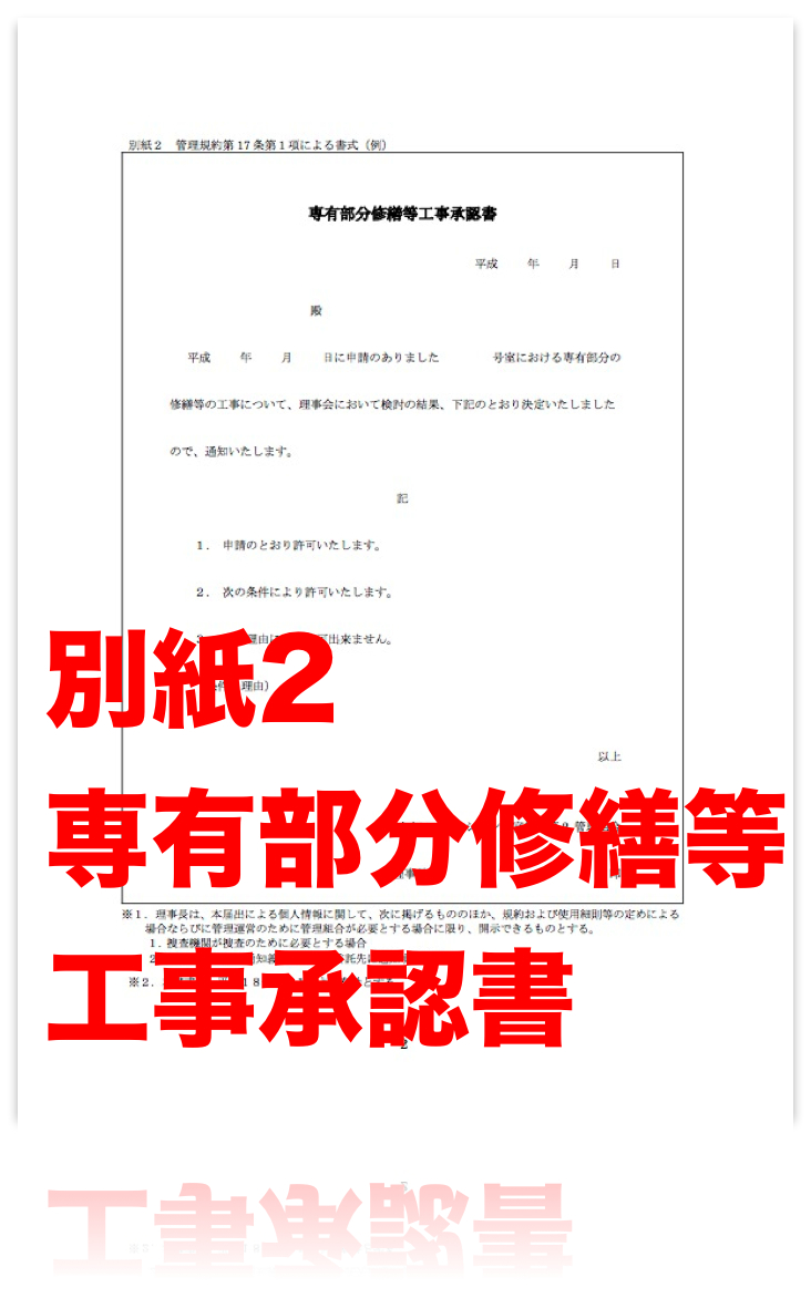 別紙2 管理規約第17条第1項による書式(例) 専有部分修繕等工事承認書 2014年3月7日 732 × 1172 別紙2 管理規約第17条第1項による書式(例) 専有部分修繕等工事承認書 別紙2 管理規約第17条第1項による書式(例) 専有部分修繕等工事承認書 別紙2 管理規約第17条第1項による書式(例) 専有部分修繕等工事承認書
