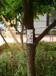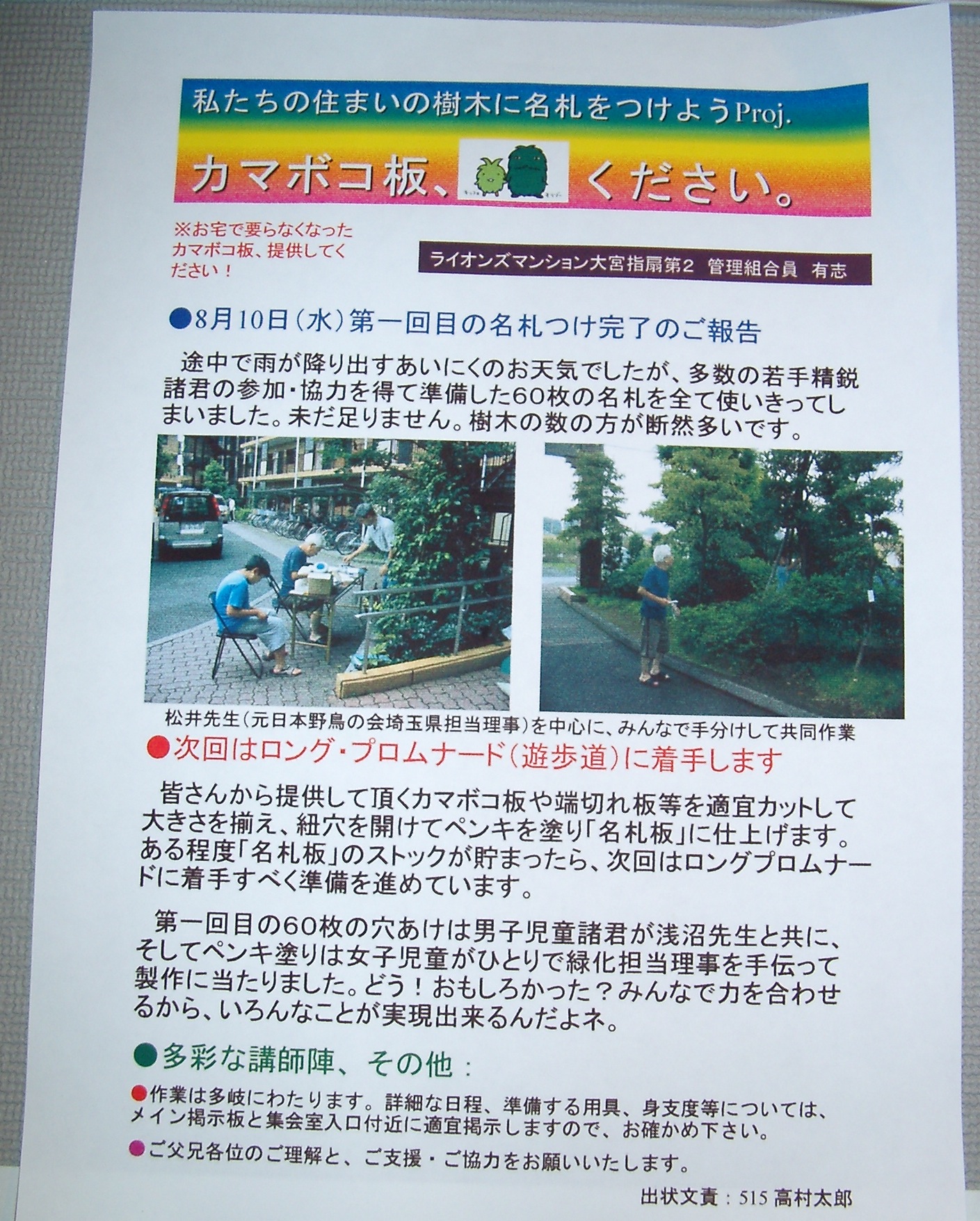 かいわい・通信, 旧ブログ マンションの樹木に名札がつきました 2005年8月10日 lionsnew 8月10日に、松井さんや高村さん、子供たちでマンション内の樹木に名札付けを行いました。名札はかまぼこの木を再利用しました。穴を開け、白く塗ったのは子供たちです。これまでにわかっただけでもマンション内の樹木や約20種類にもなります。意外に多いと思いませんか。