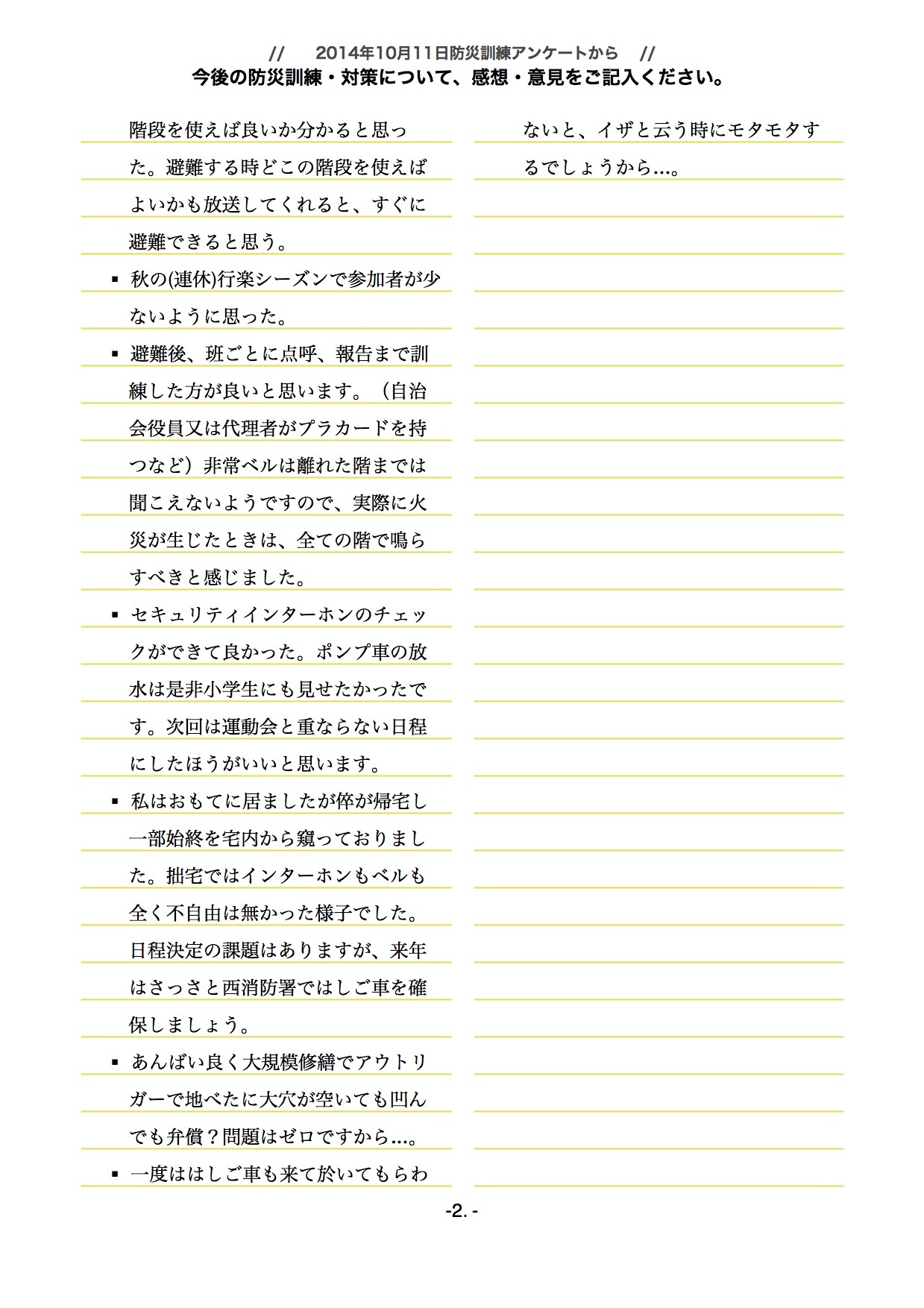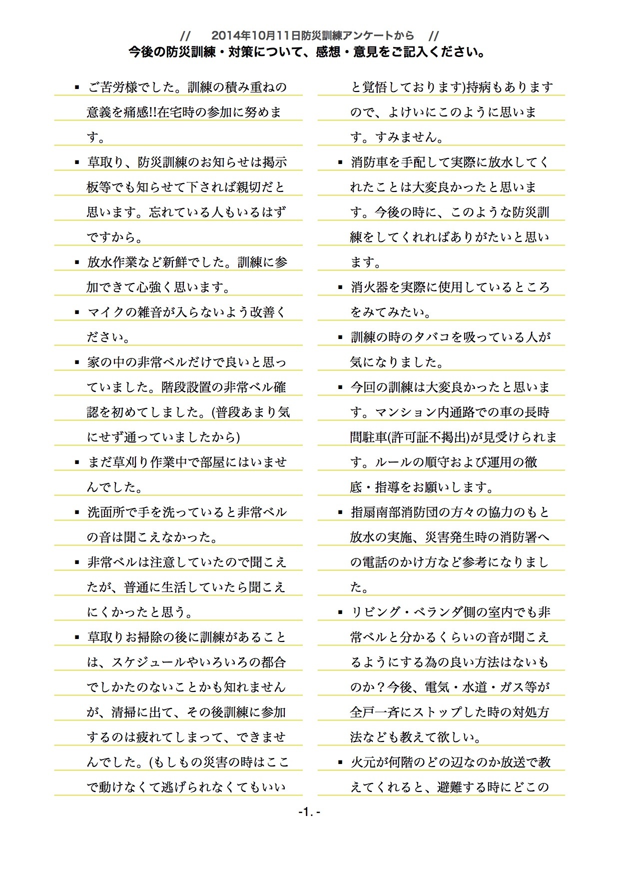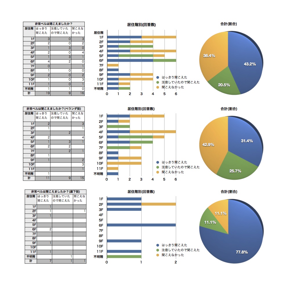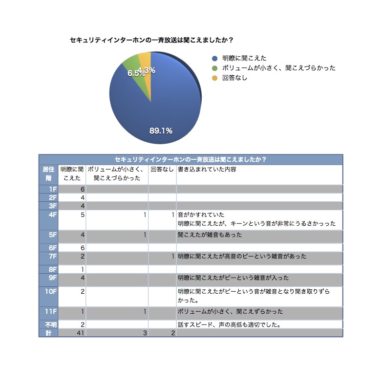 防災訓練アンケート2014 10月11日(土)に実施した防災訓練後に行ったアンケートの報告です。 Webも含め46件の回答をいただきました。ご協力ありがとうございました。 1. セキュリティインターホンの一斉放送は聞こえましたか? 20141011アンケート報告1 2. 一斉避難放送後に6Fと7Fの非常ベルが鳴りました。部屋から避難する前に聞こえましたか? 20141011アンケート報告2 3. 今後の防災訓練・対策について、感想・意見をご記入ください。