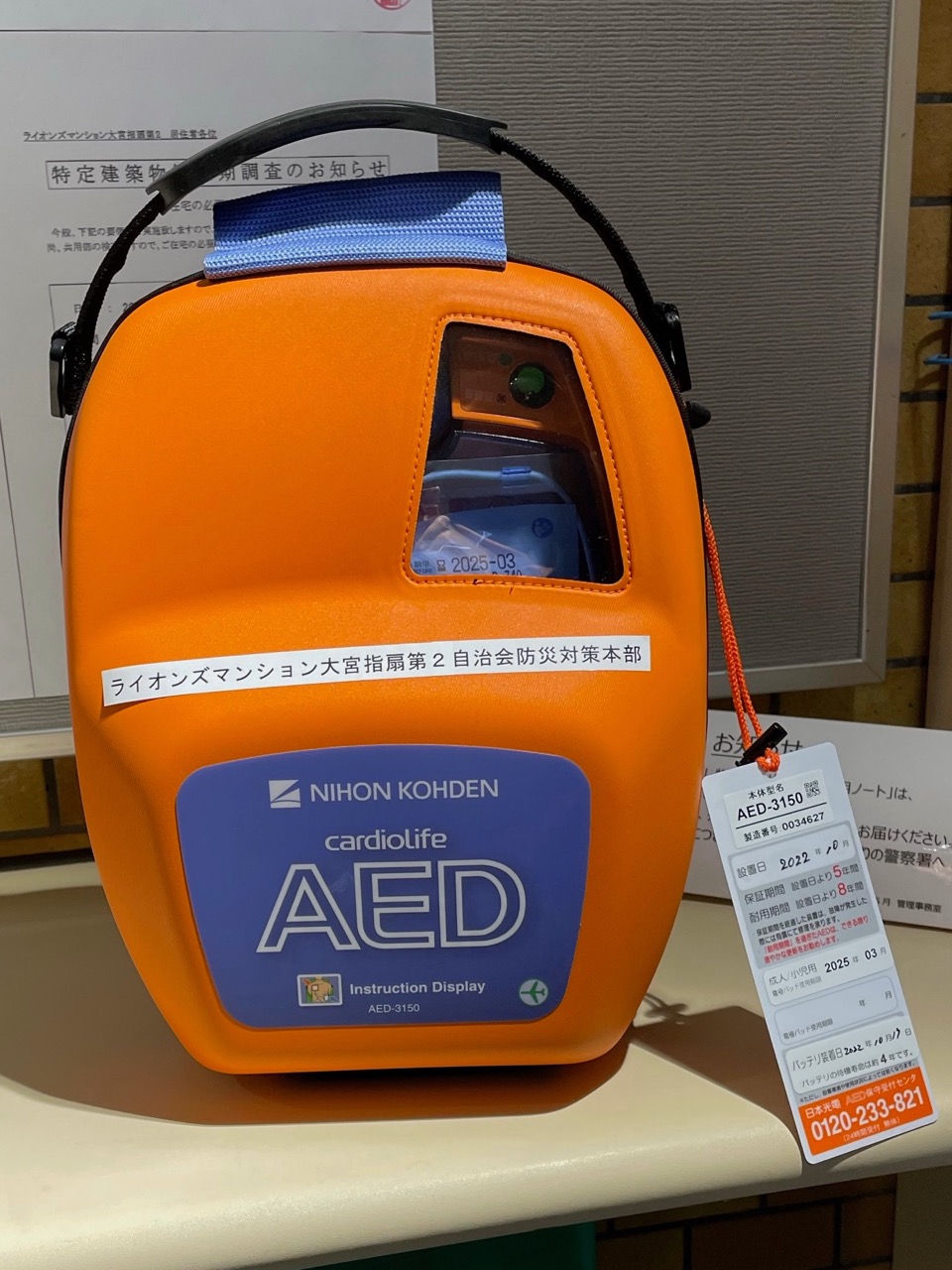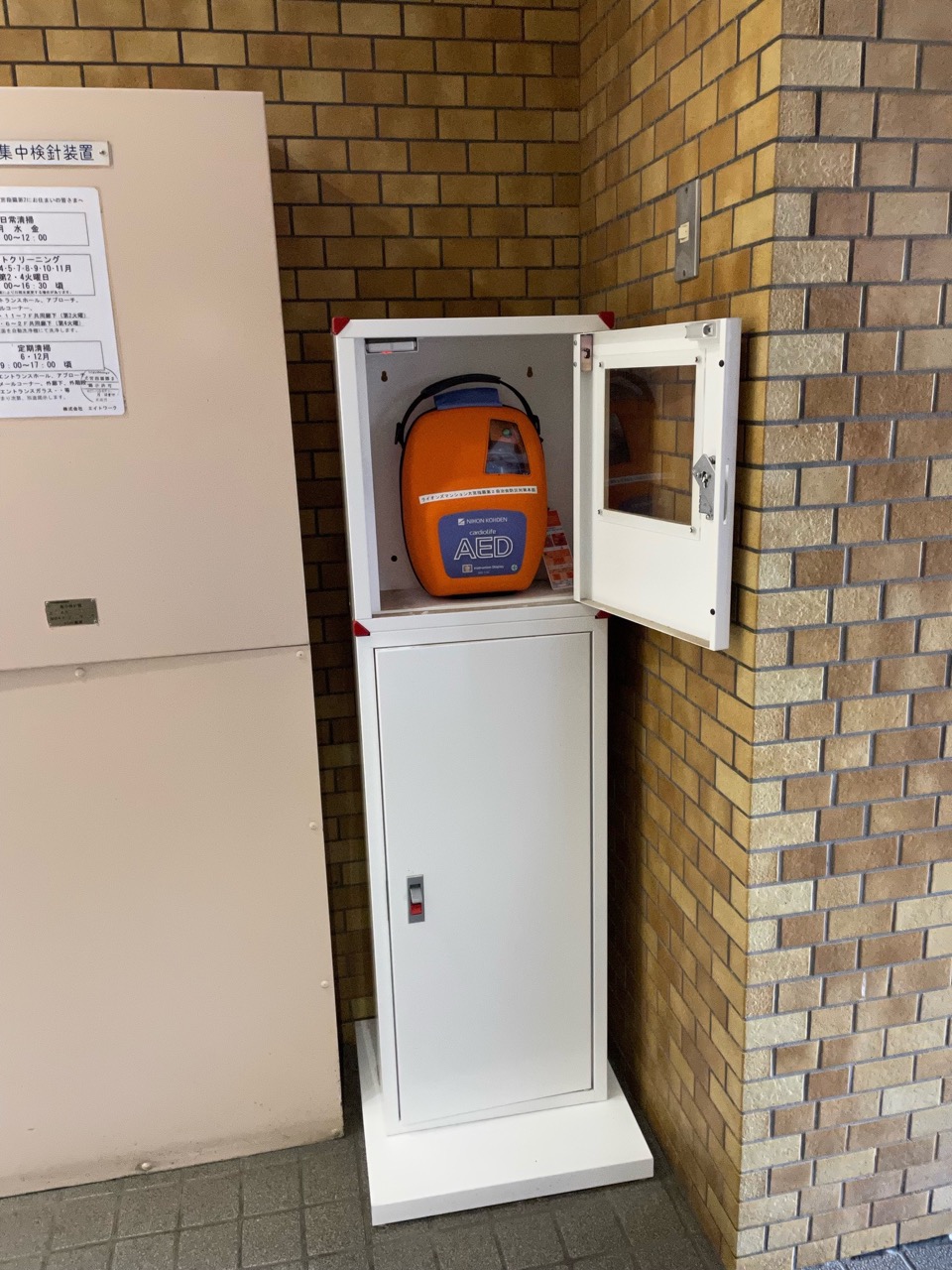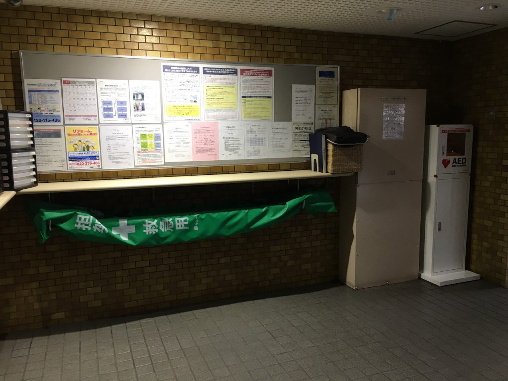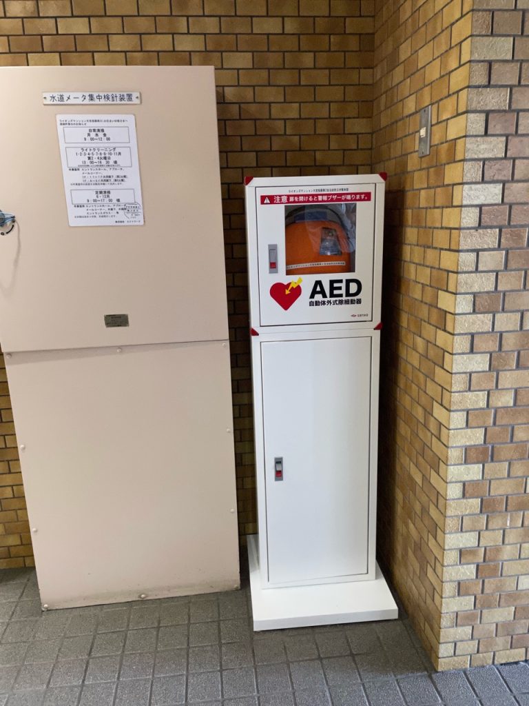1階エントランスに2015年に設置され、2022年に更新されました。緊急時は迷わず使用してください。