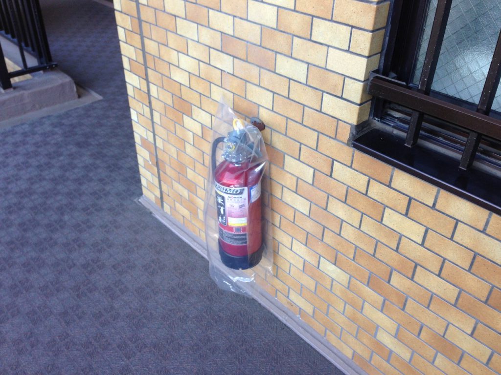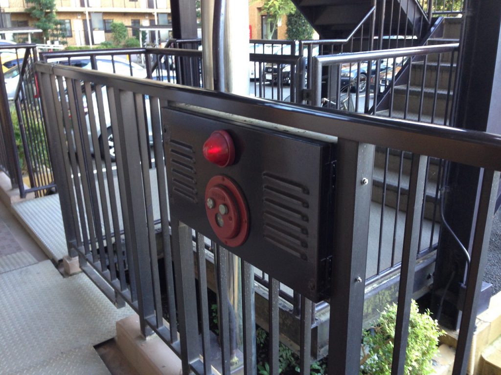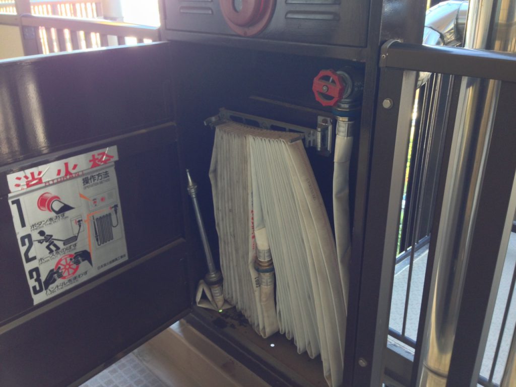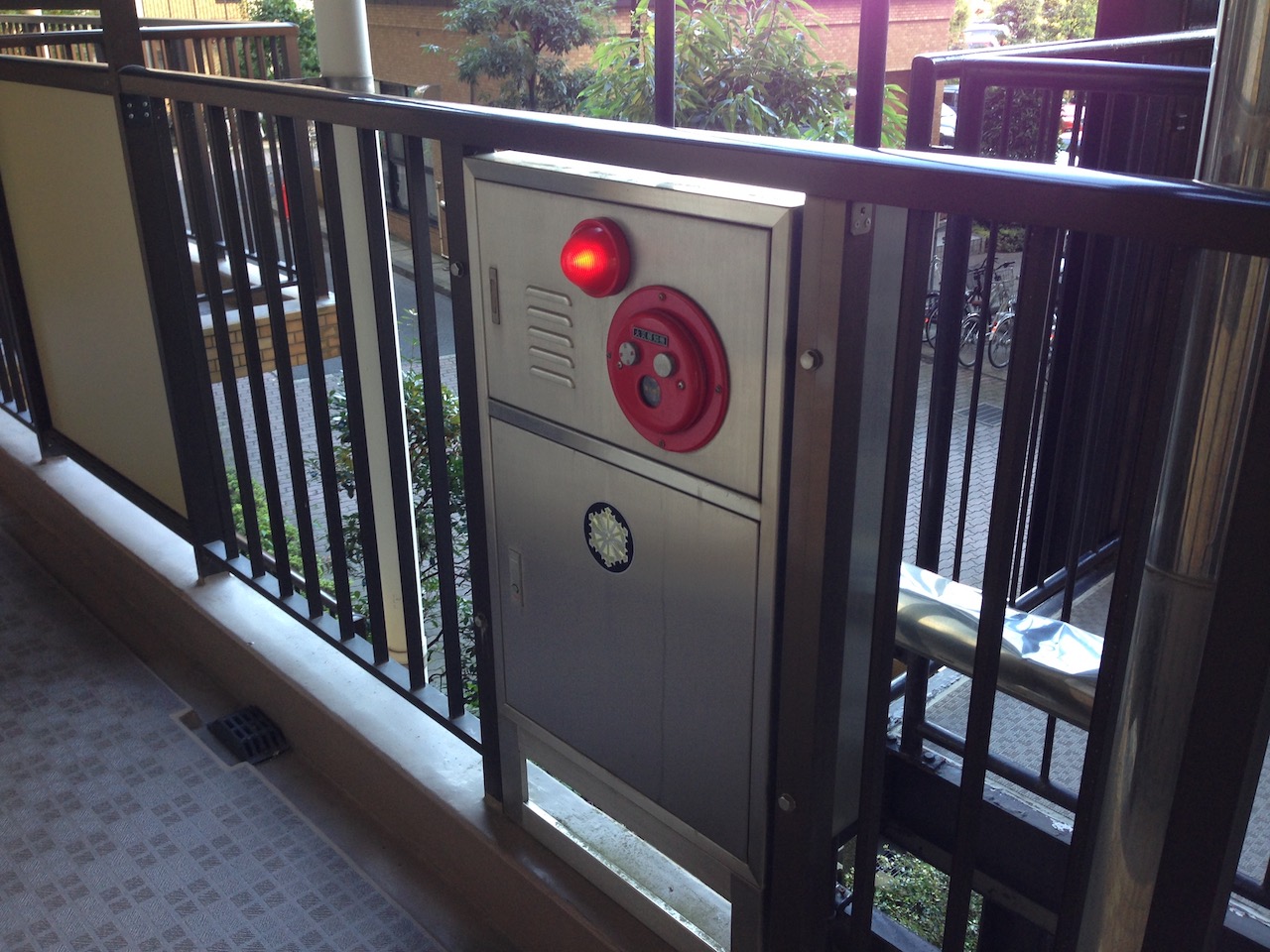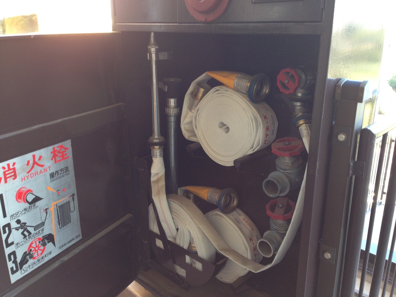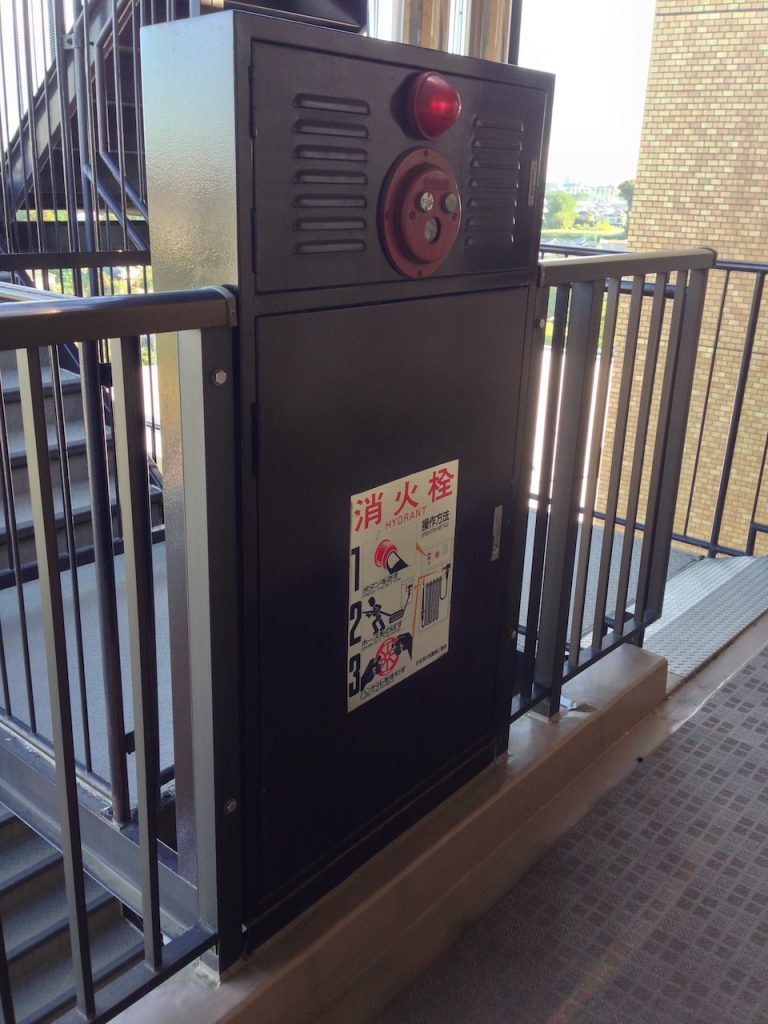 各階の通路側には、消火器、非常ベル、1階からの送水管出口(消防ホースをつなぐ)が設置されています。