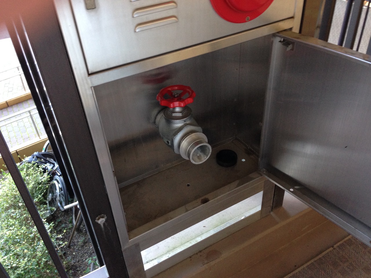 11階には消防ホースが接続済の独自の消火栓が設置されています。さらに1階からの送水管出口(消防ホースをつなぐ)が設置されています。