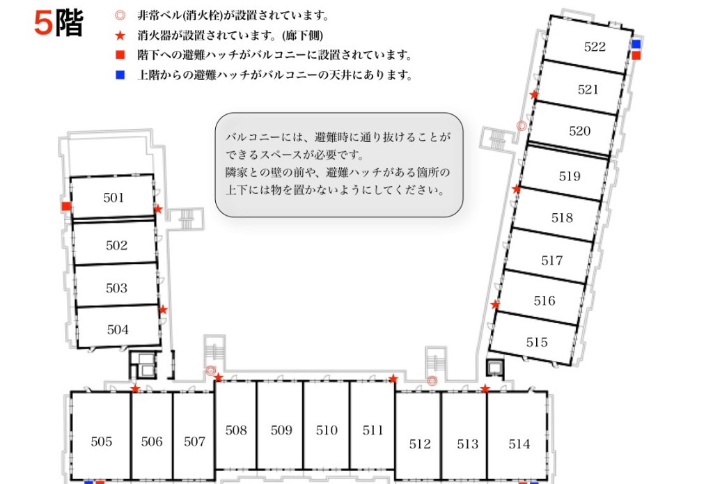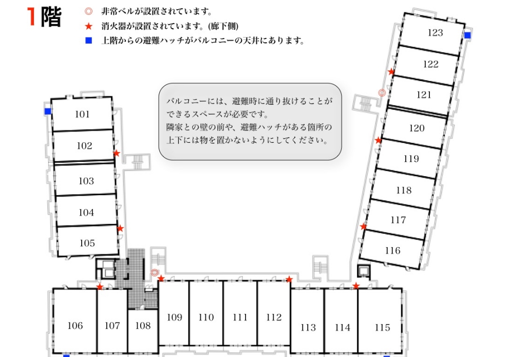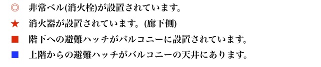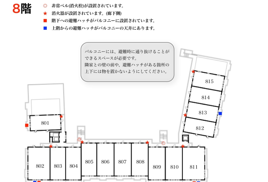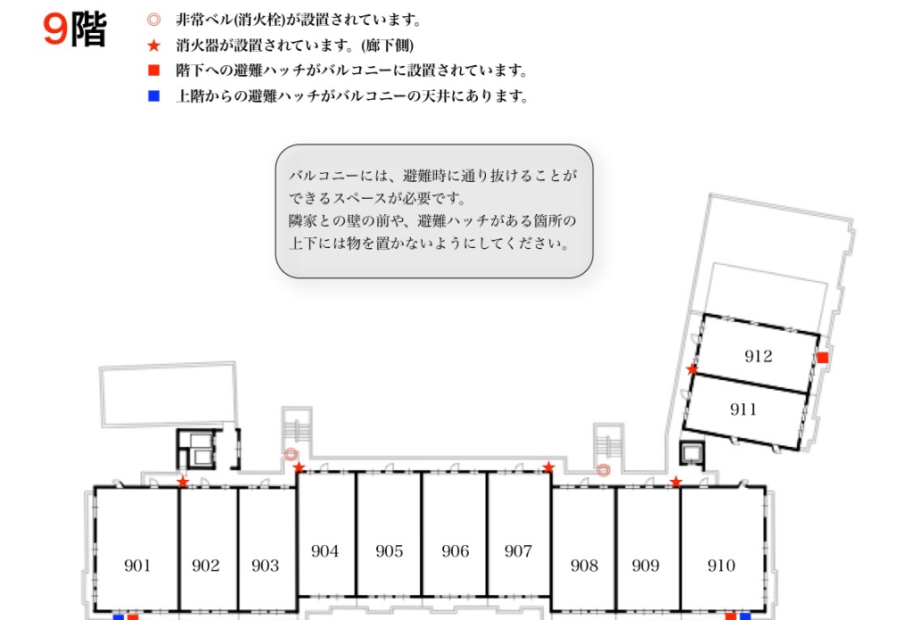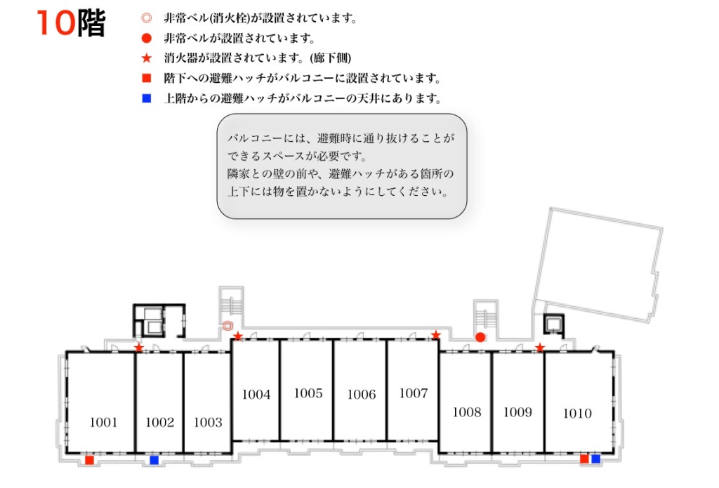 各階の非常ベル・消火栓、消火器、ベランダ避難ハッチの設置場所