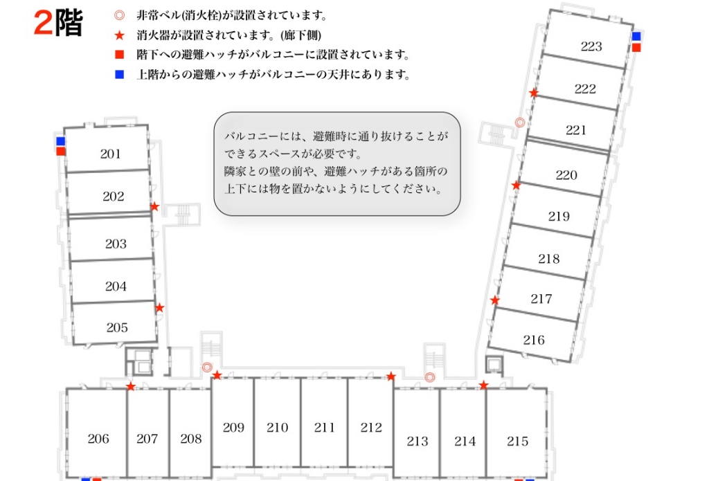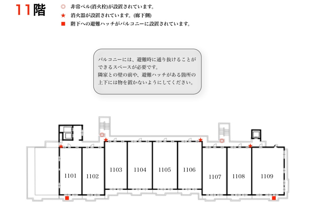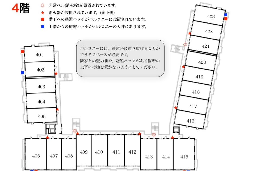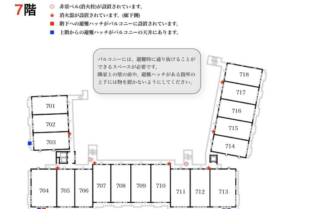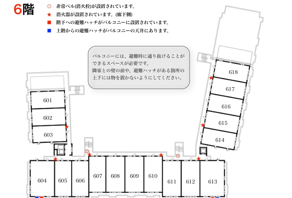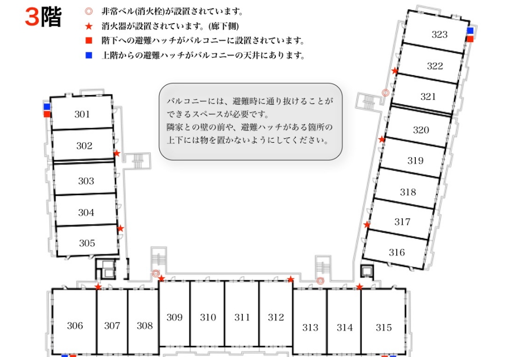 各階の非常ベル・消火栓、消火器、ベランダ避難ハッチの設置場所