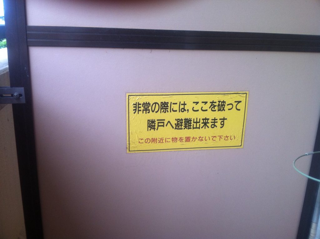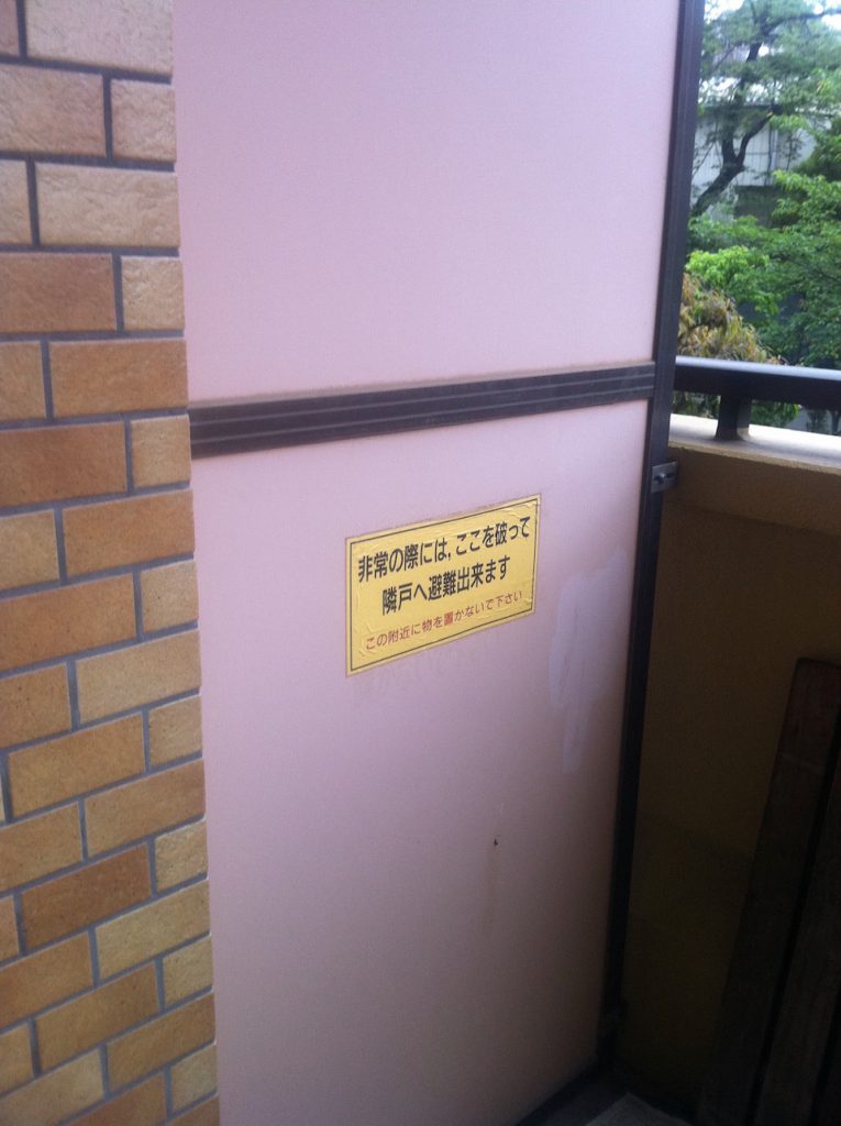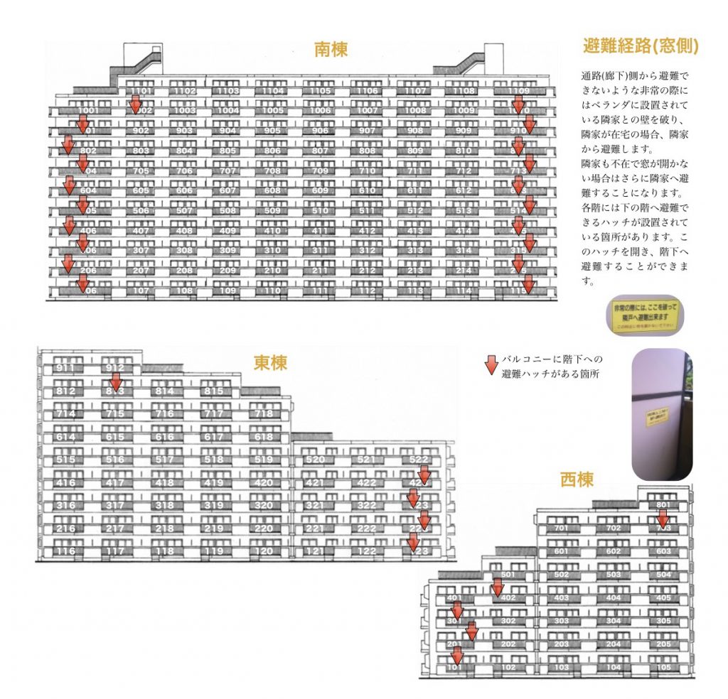 8.ベランダ側避難経路・避難ハッチ 通路(廊下)側から避難できないような非常の際にはベランダに設置されている隣家との壁を破り、隣家が在宅の場合、隣家から避難します。隣家も不在で窓が開かない場合はさらに隣家へ避難することになります。各階には下の階へ避難できるハッチが設置されている箇所があります。このハッチを開き、階下へ避難することができます。 ベランダ側の隣との仕切り 避難ハッチ設置一覧 ベランダ避難経路確保のお願い(2020年10月)