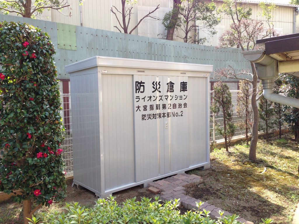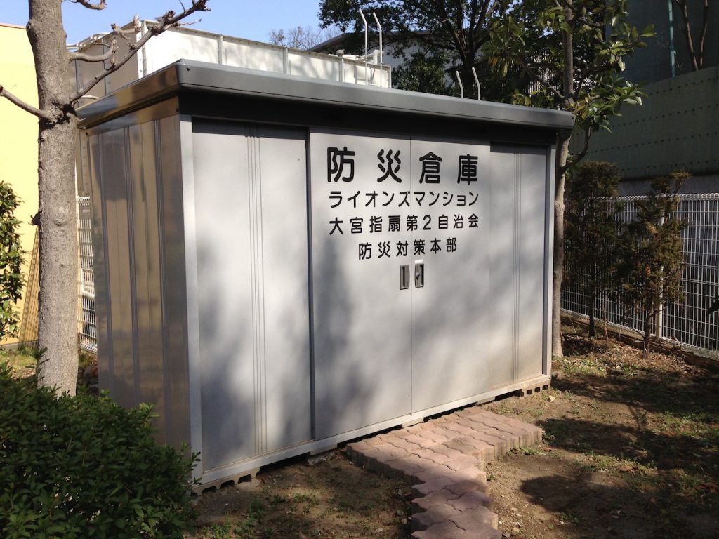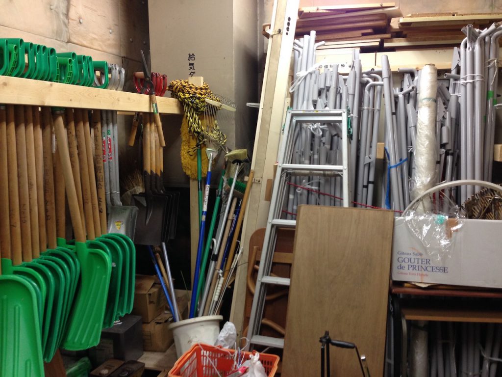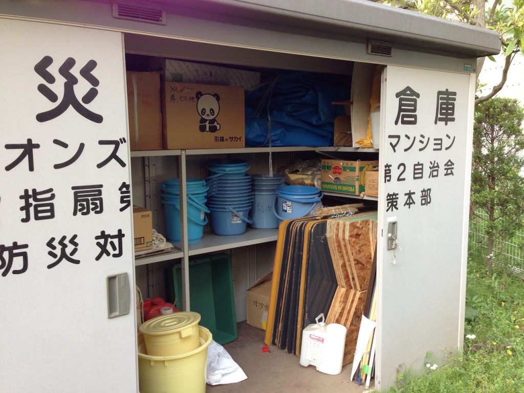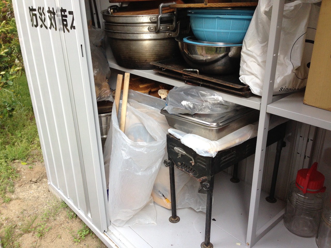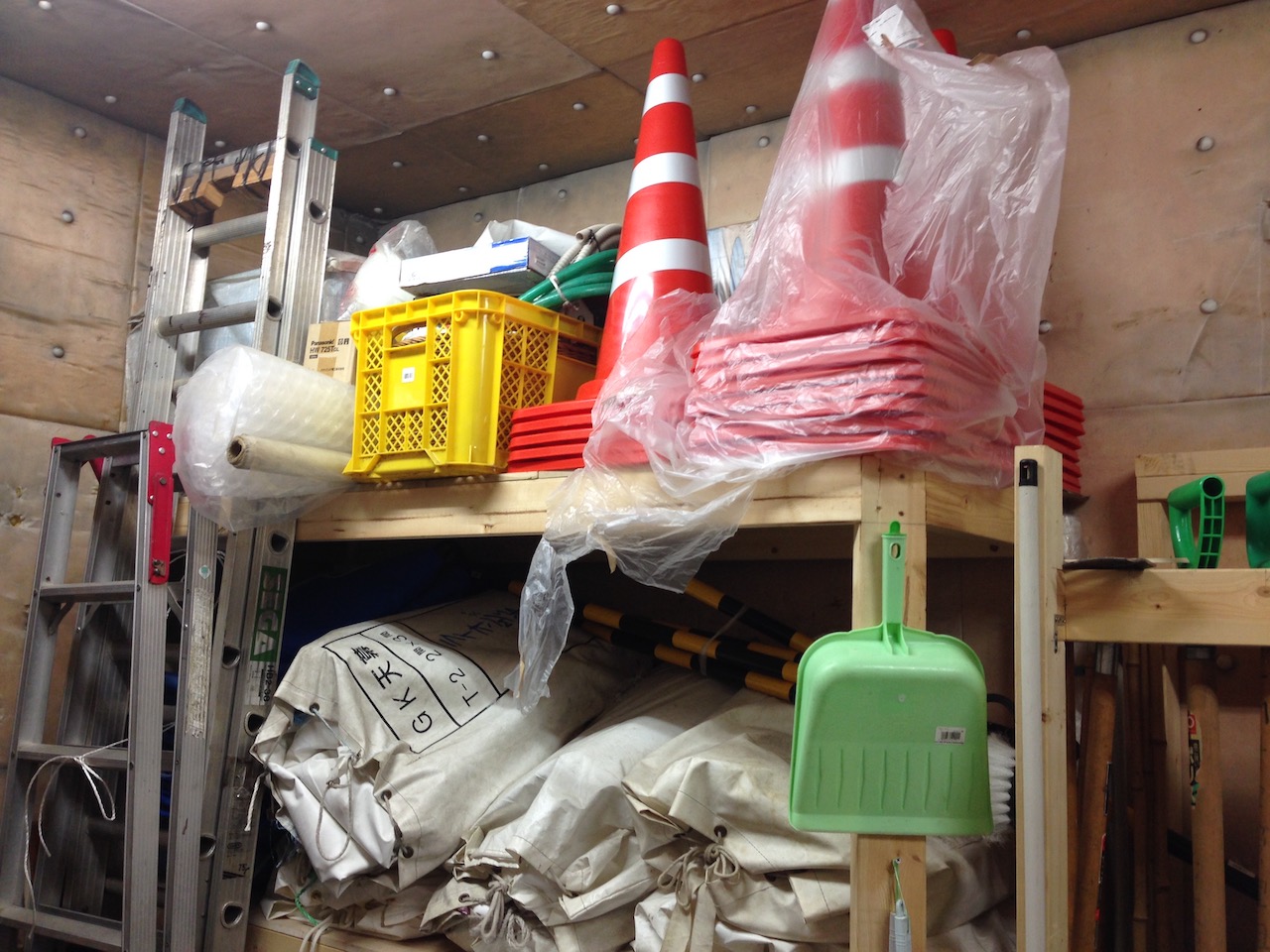 9.防災倉庫 防災備品は、防災倉庫(2箇所)、集会室、浄化槽機械室に保管されています。通常は施錠されていますが、いざという時に利用できるように鍵を共通管理しています。 防災倉庫 防災倉庫 防災倉庫No.2 防災倉庫No.2 リヤカー(組み立て式) 防災倉庫No.2は主に炊き出し用の用具類を保管、リヤカーは南棟東側外階段下にあります。 バール スコップ類、テント支柱 テント、カラーコーン類 浄化槽機械室