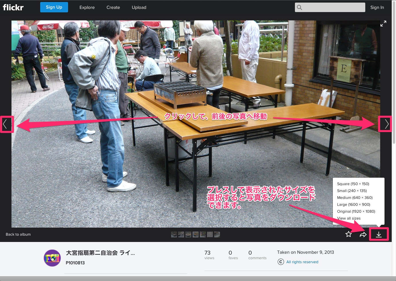 写真をダウンロードするには右下の下向きの↓マークをプレスし、表示された枠の中からダウンロードしたいサイズを選択します。